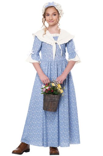 Costume turns your child into a pilgrim from the Colonial Period! It comes with a pullover dress that has a cinched waist and a blue floral pattern. It has a ruffled bust and white bows on the sleeves to help bring the look together. The included fits over the shoulders and ties in the front. Finally, the hat features an elastic band to help keep it secured on your child’s head. Put it all together and you have an authentic look, perfect for school plays and historical reenactments.
