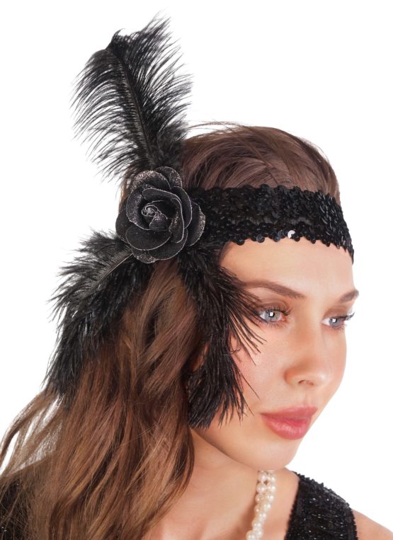 Silver sequin headband with black feather
