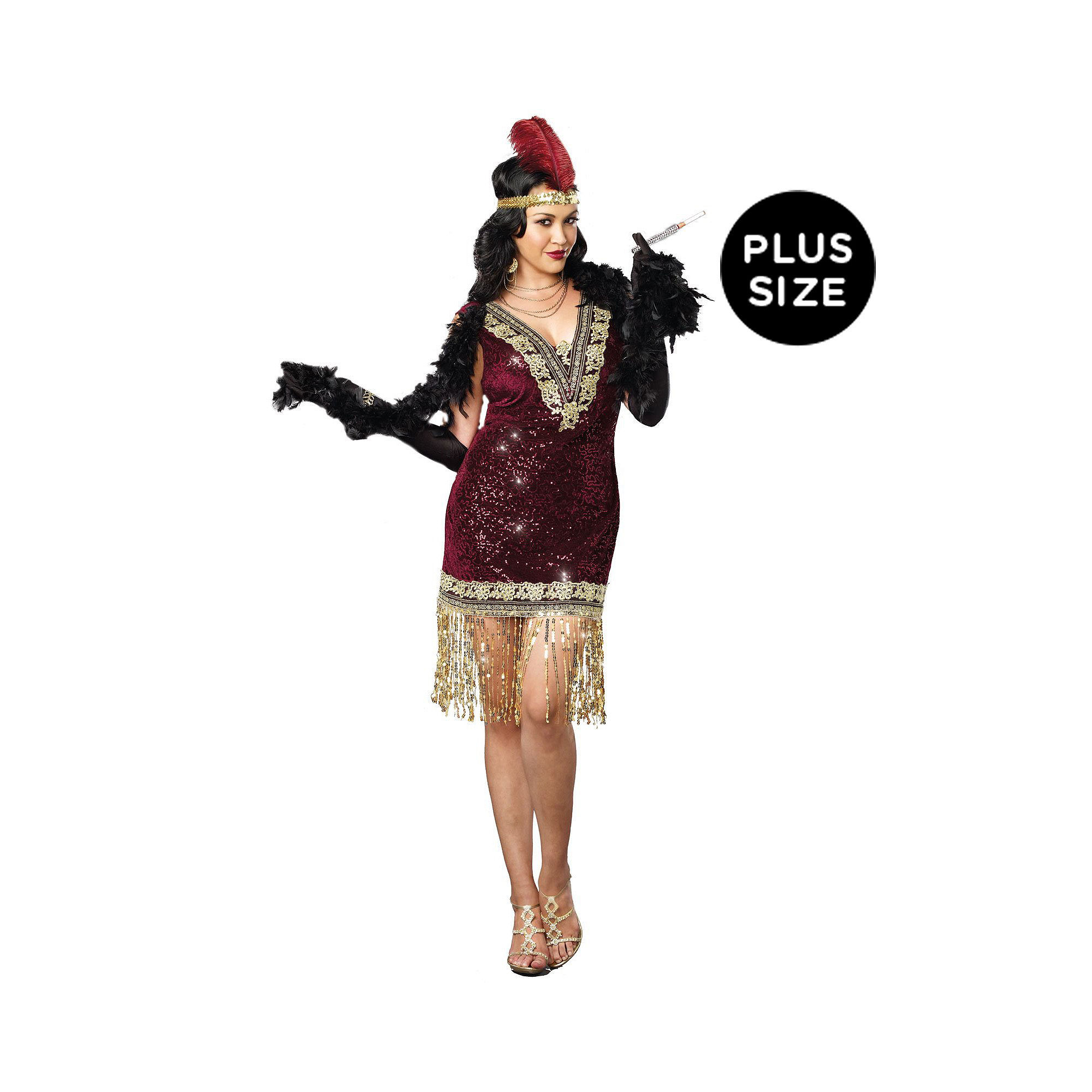 Women’s Sophisticated Lady Costume. Drinking, smoking, sequins shining bright, this sophisticated lady loves to dance all night. Time to shimmy and dazzle in this jaw-dropping burgundy velvet with sequin scroll design dress featuring gold sequin fringe and an ostrich feather headpiece. Accessorize with satin gloves, jewelry and a boa for some extra sass!