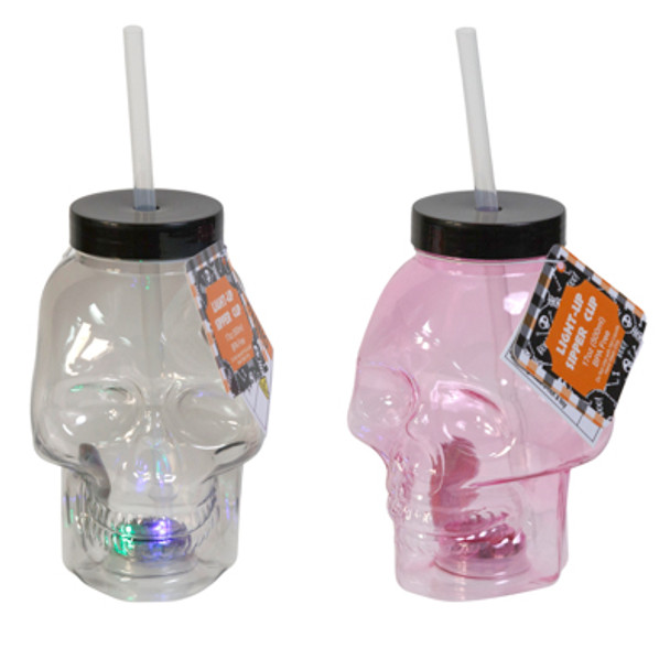 SKULL HEAD SIPPER CUP W/STRAW LIGHT-UP 3-FUNCTION PLASTIC 2AST COLORS 17OZ