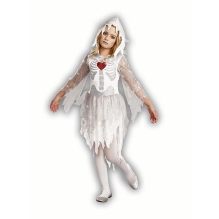Girls Sweet ‘n Spooky Skeleton Costume Knit hooded dress with glitter ribcage screen print accented with sequin heart patch, 2-layer lace and sheer glitter mesh sleeves, and multi-layered hi-low skirt.