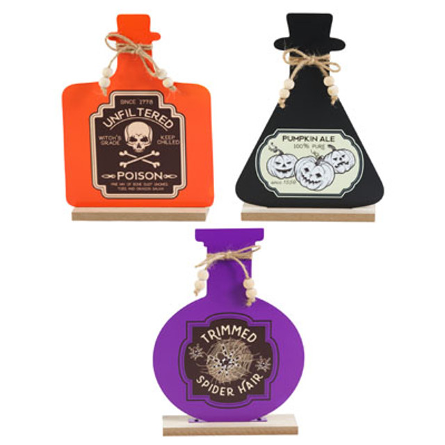 / TABLE DECOR HALLOWEEN POISON BOTTLE METAL 5.25X7IN 3AST W/TWINE BOW & BEADS COMPLY/LABEL