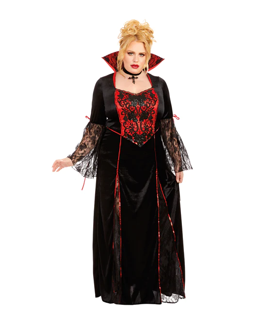Gorgeous black velvet gown has a lace accented stand up collar, sleeves and godets filled with delicate lace that matches the flowing lace sleeve detail; with red sequin piping. Center front applique has faux leather and sequin accents. Also includes gothic cross necklace choker.