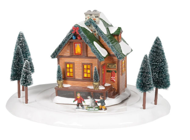 A thick blanket of snow covers the yard, it’s the perfect day for sledding. Our sled dog friend enjoys a ride around the cabin. Inside, the warm glow of the cabin and a candle in the upper window welcomes the kids to come in for some hot cocoa.